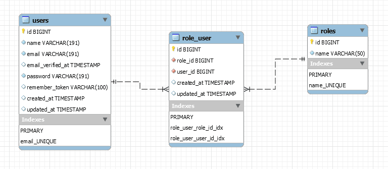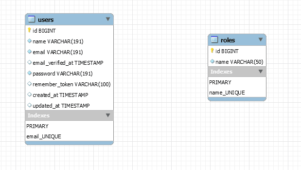 It is very similar as the previous design except you won’t have foreign keys in the users or roles table. There will be a pivot table that will have a foreign key for the users and roles table. You also won’t need to have the roles table created prior to the users table. But both users and roles table need to exist before the pivot table is created.